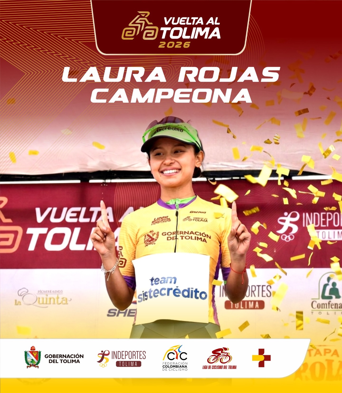 La ciclista Laura Rojas, del Team Sistecrédito, se coronó campeona de la Vuelta al Tolima 2026 tras completar la competencia con un tiempo general de 07:53:41, resultado que le permitió imponerse con autoridad en la clasificación general femenina.
